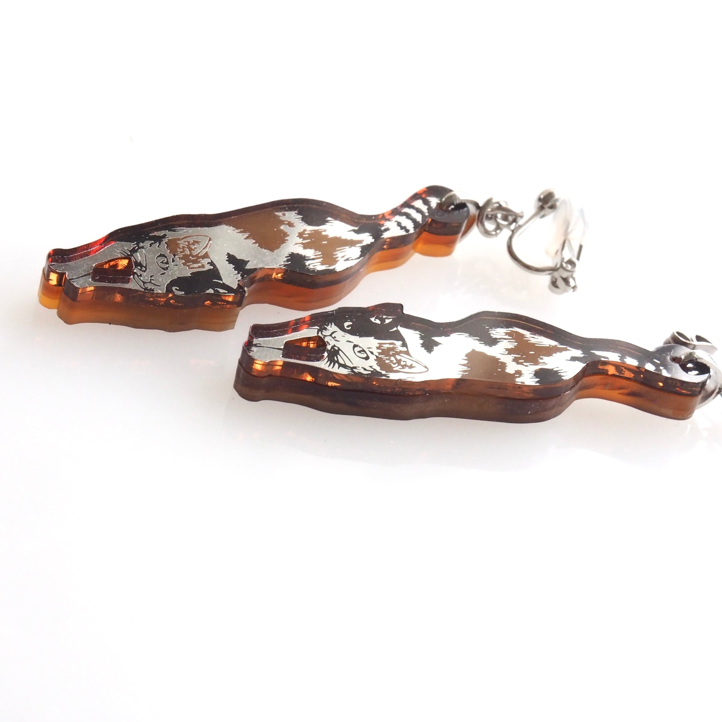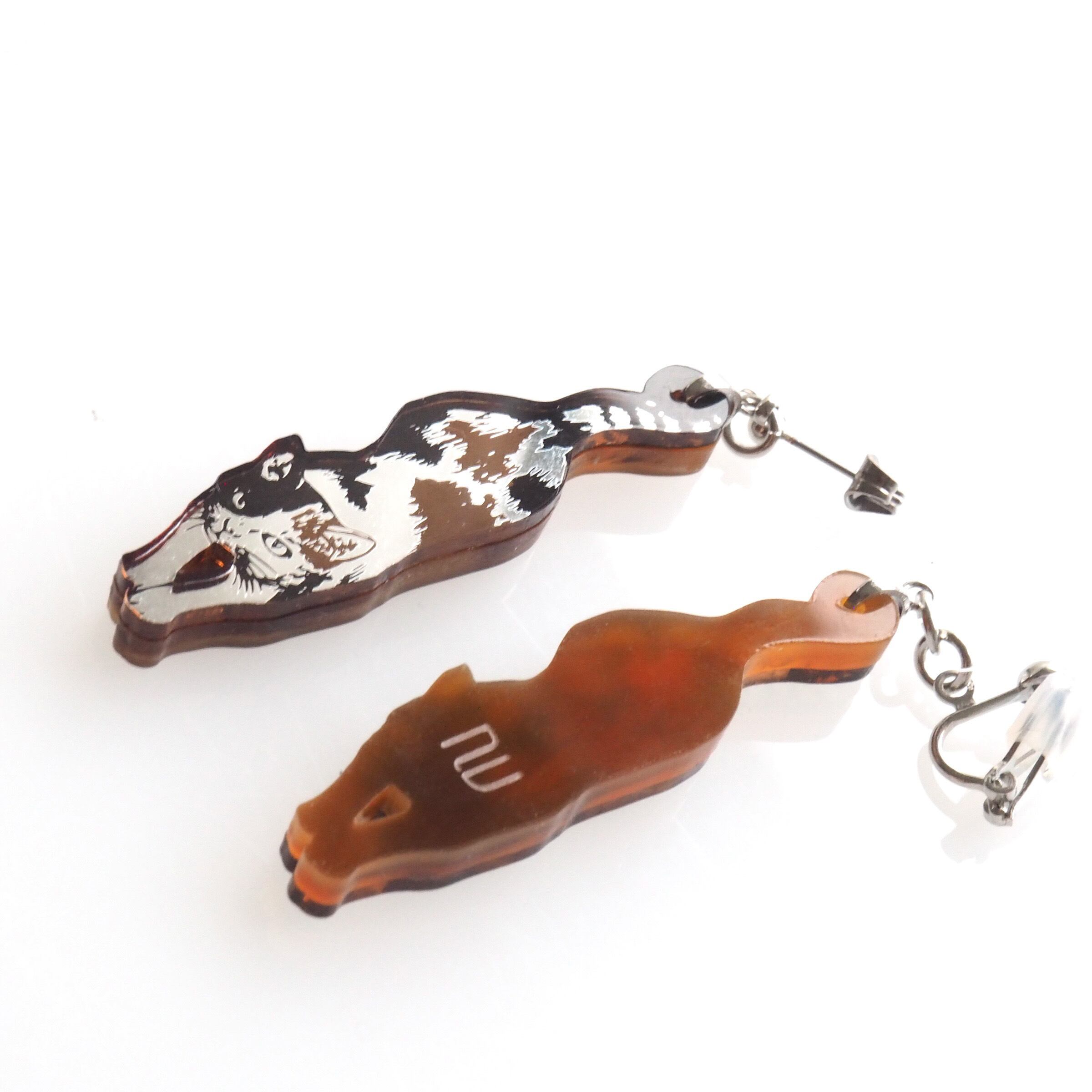 ぶら下がり猫のミラーアクリルピアスです。