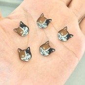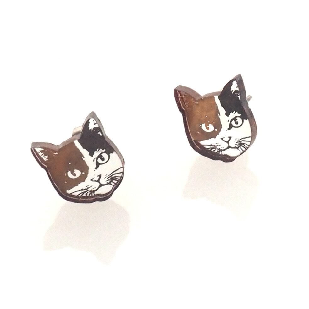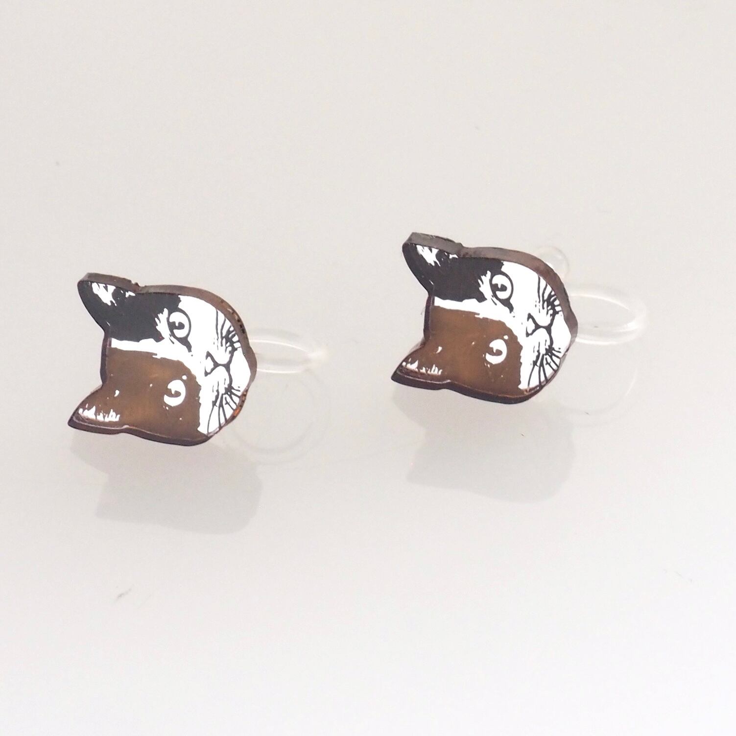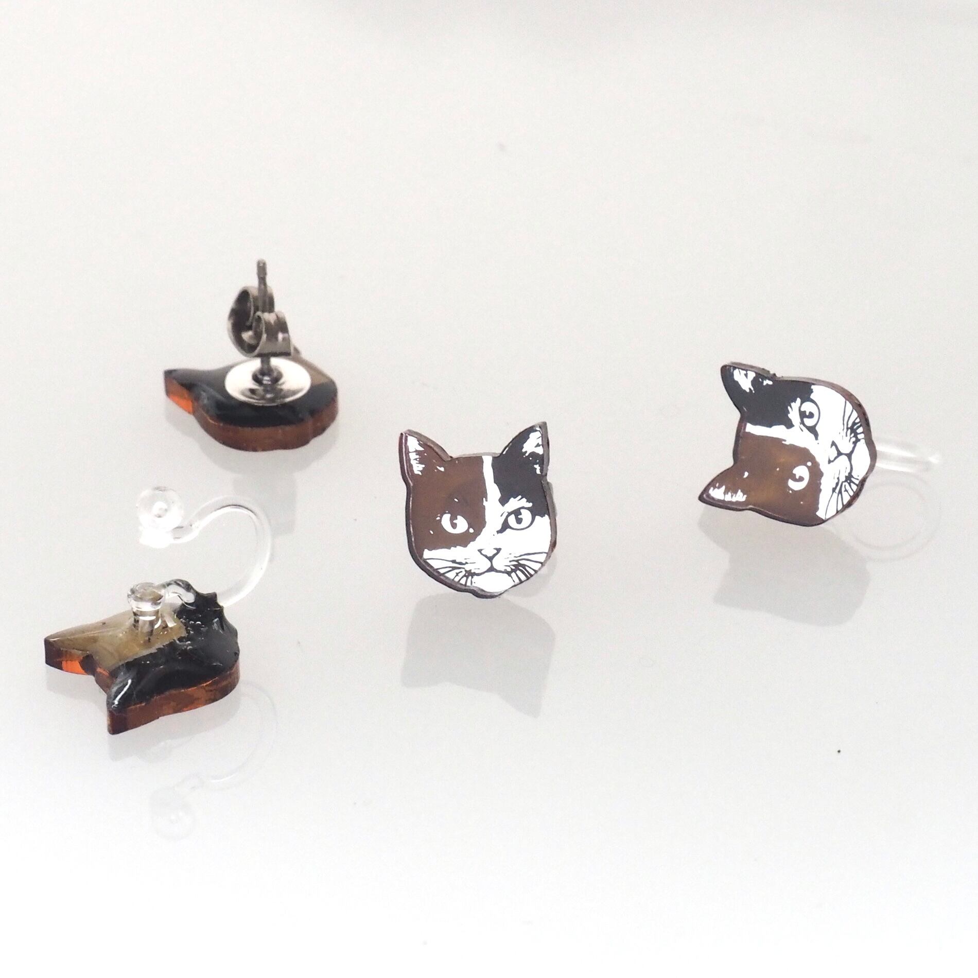 個性的なミラー調の猫の顔のスタッド(ノンホール)ピアスです。
