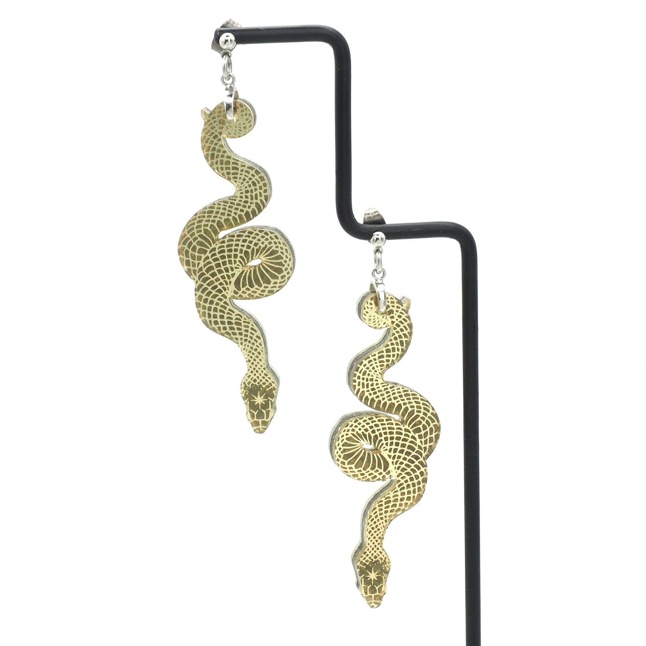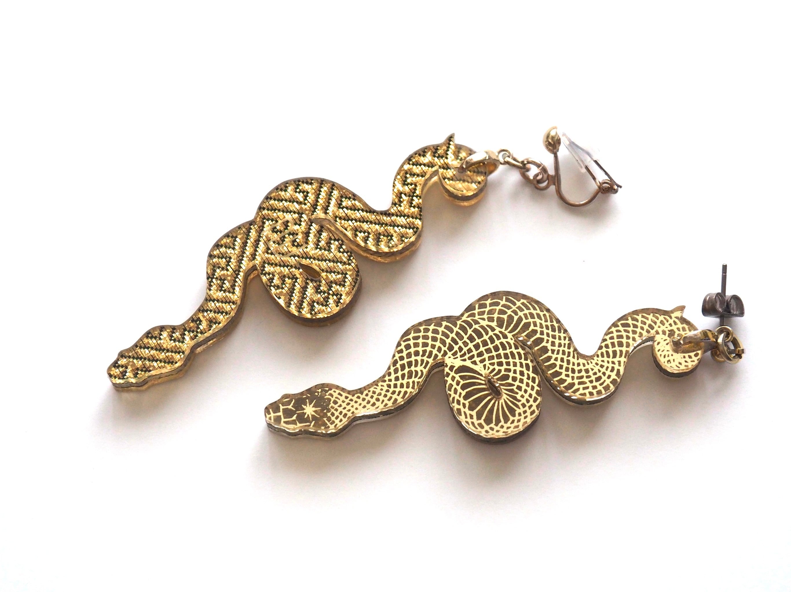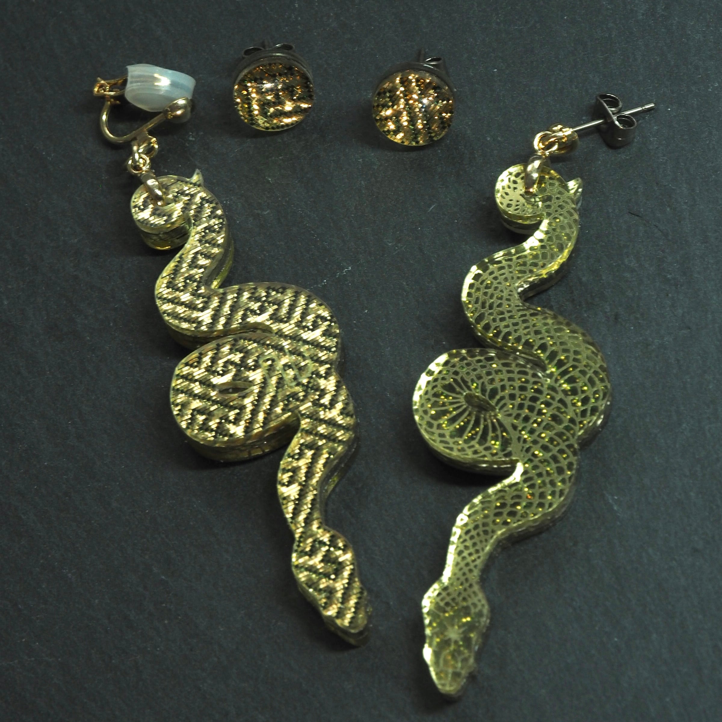 今年の干支、巳年の縁起の良い金の蛇のミラーアクリルピアス。