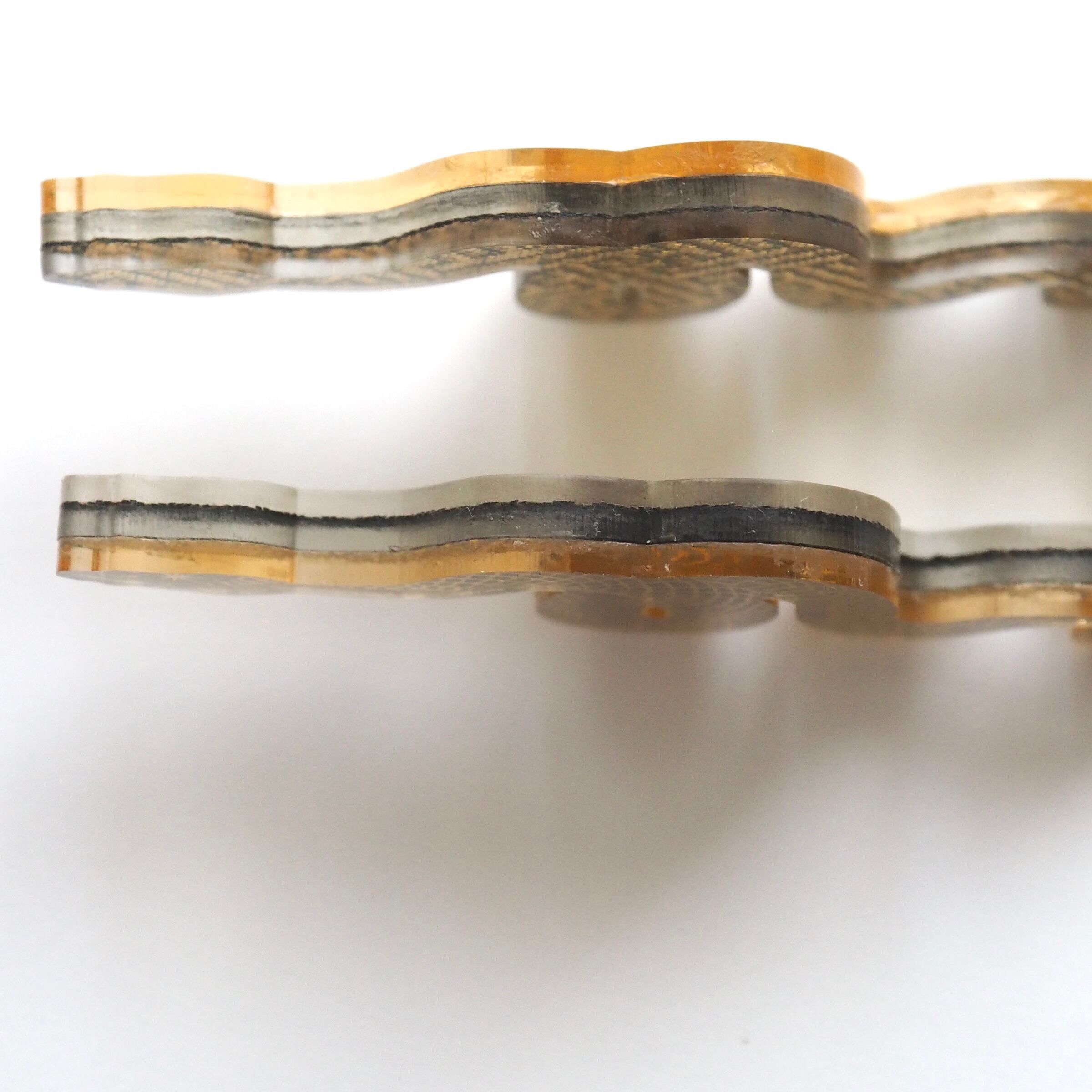 裏は『金襴』という金糸を使った、平安時代から続く織物技術で作られたテキスタイルがアクリルに封入され、立体的な輝きがあります。