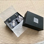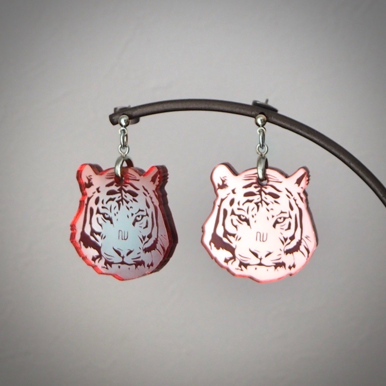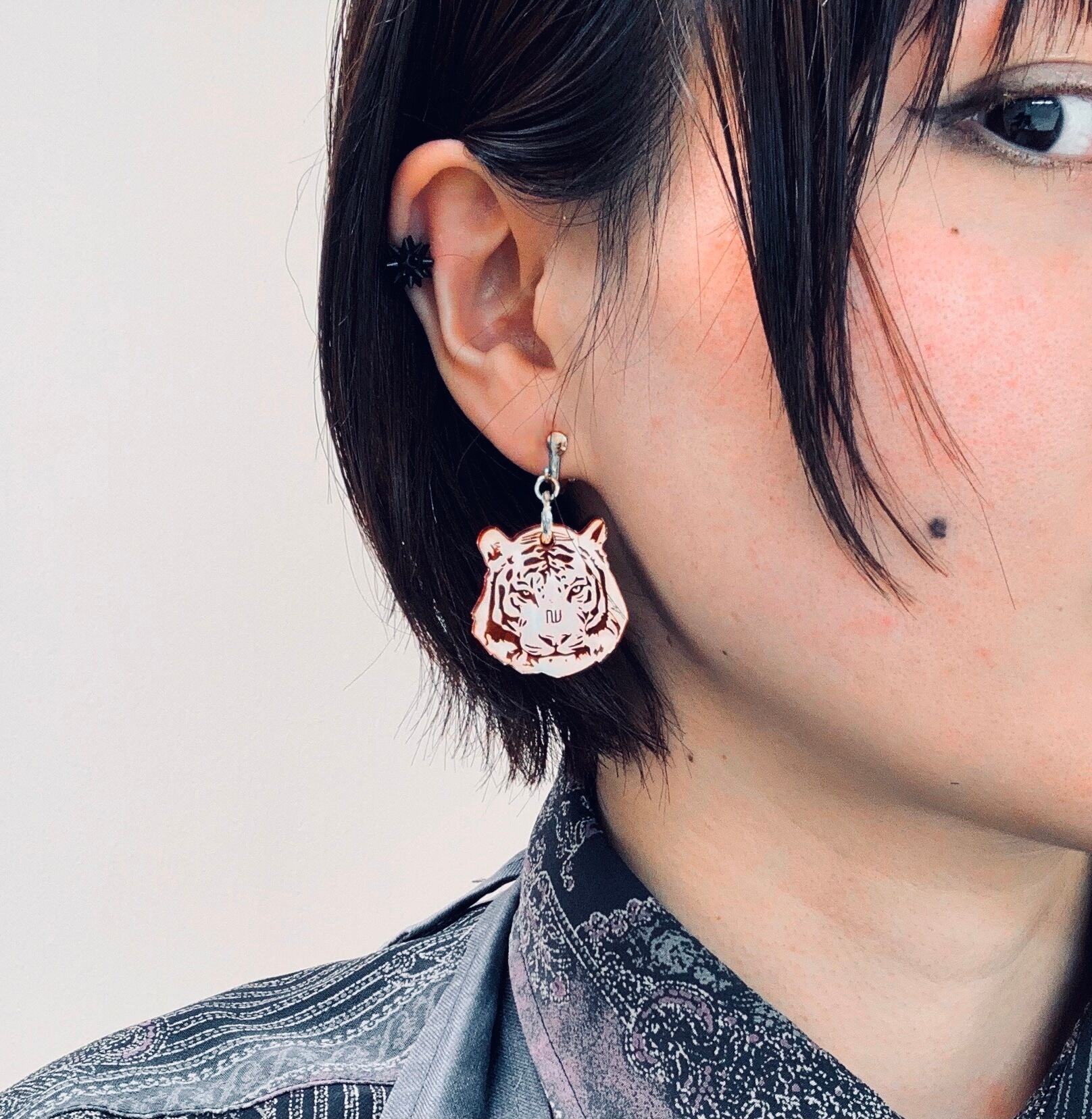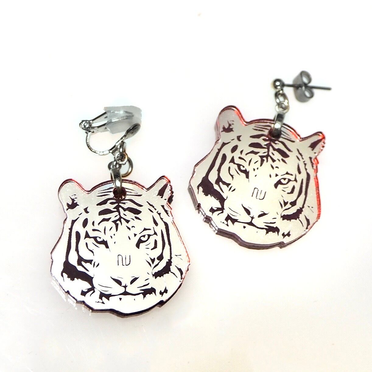印象的なミラー調の虎の顔のアクリルピアスです。