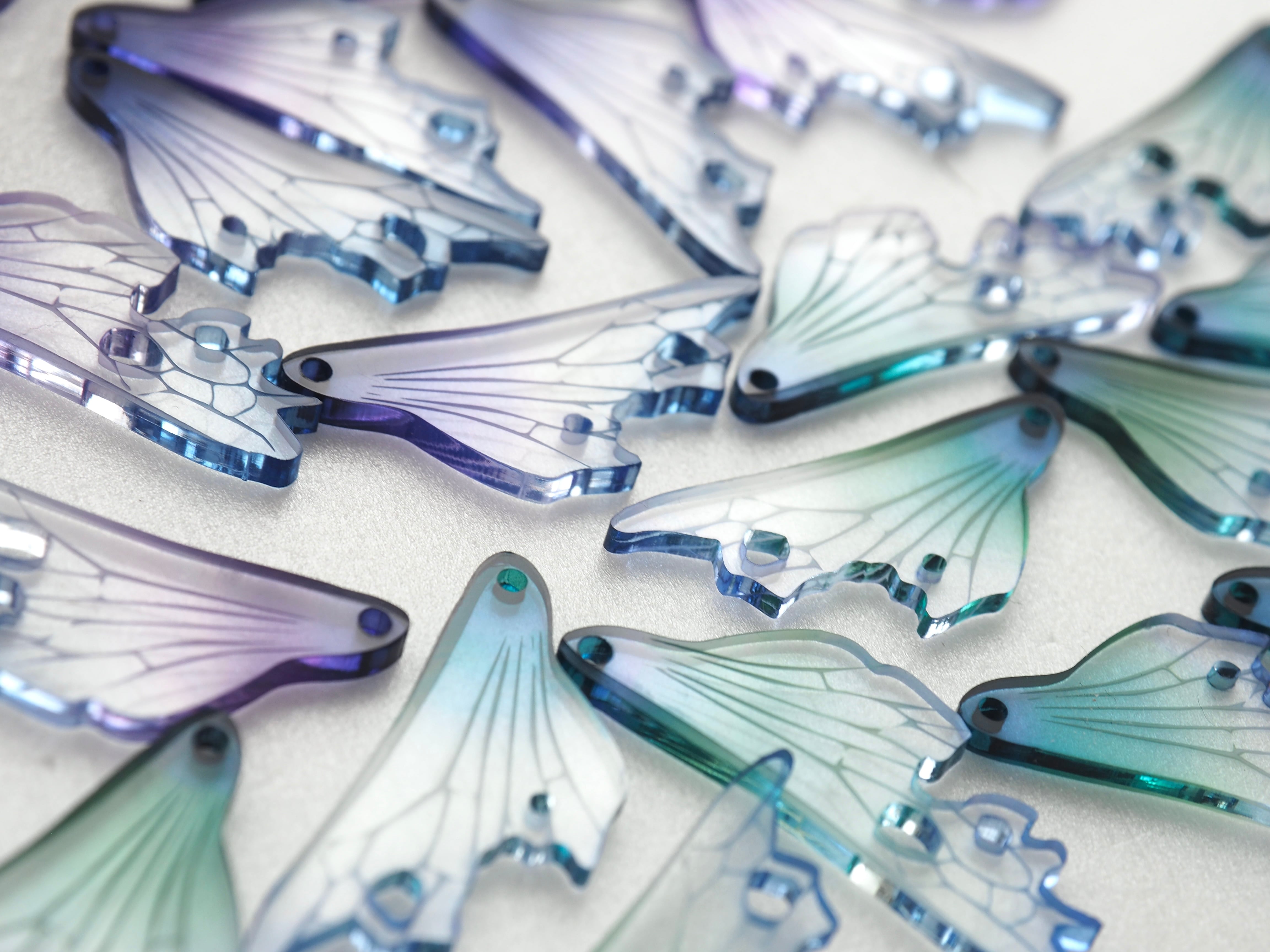 デザイン、透明なアクリル板の切り出しから全て自身で製作し、染色も一つ一つ丁寧に手作業で行っています。
