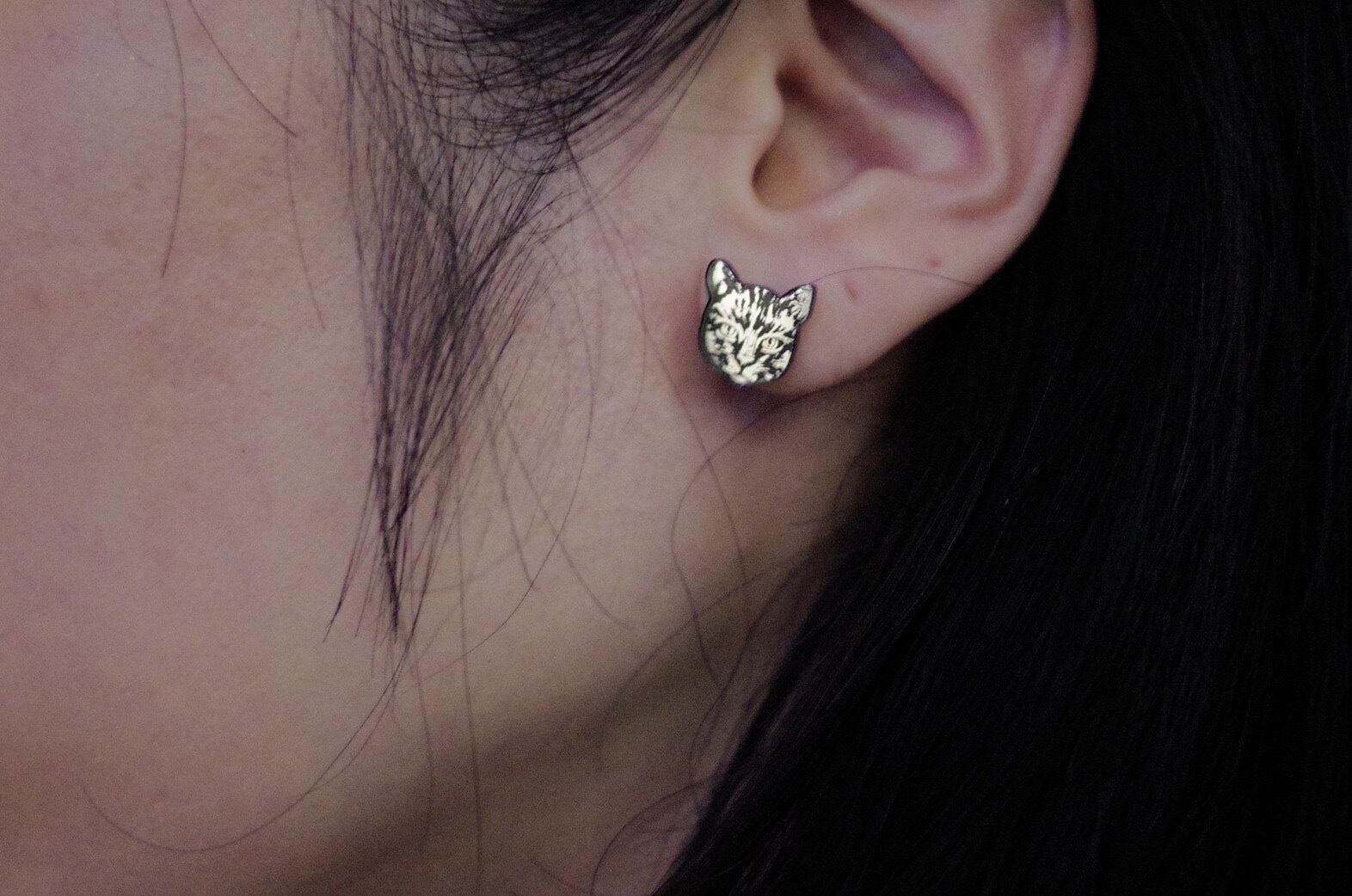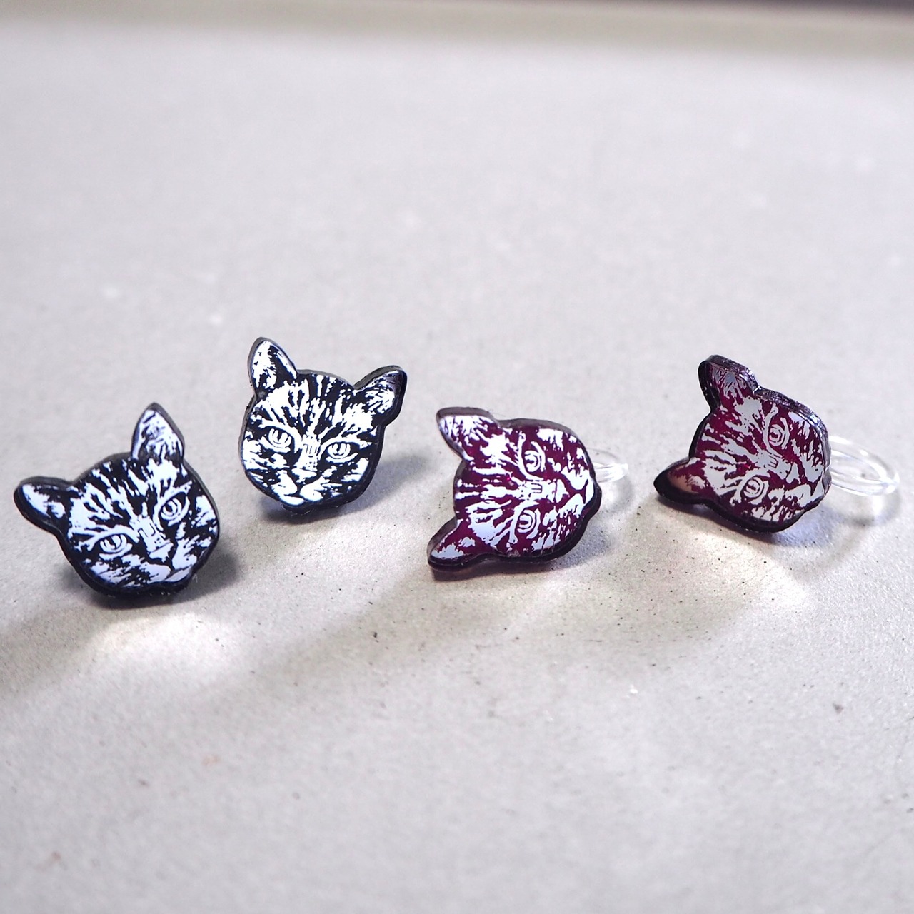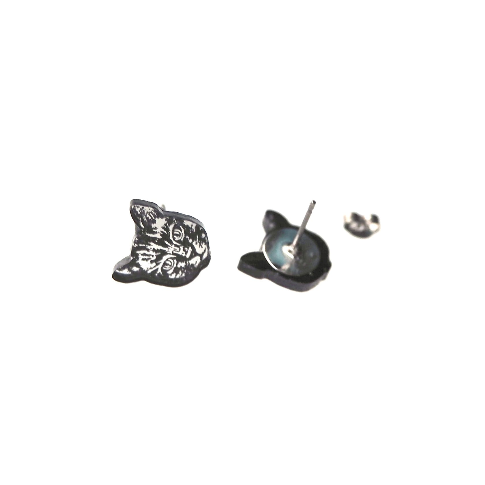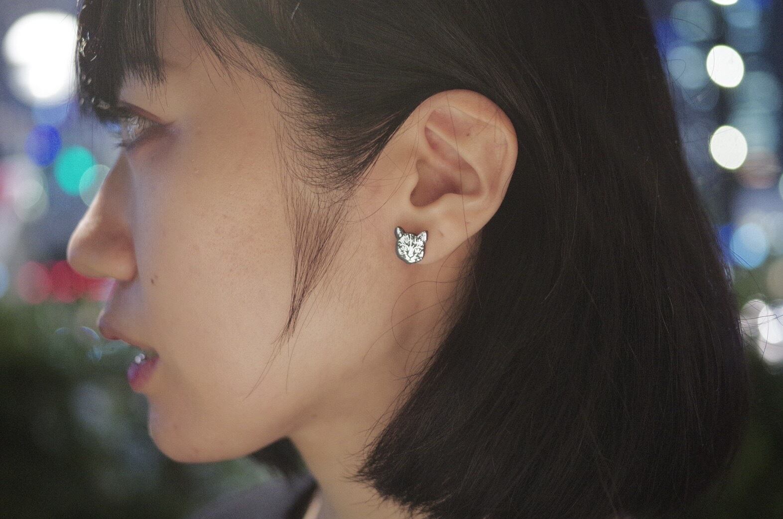 個性的なミラー調の猫の顔のスタッド(ノンホール)ピアスです。