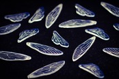 デザイン、透明なアクリル板の切り出しから全て自身で製作し、染色も一つ一つ丁寧に手作業で行っています。