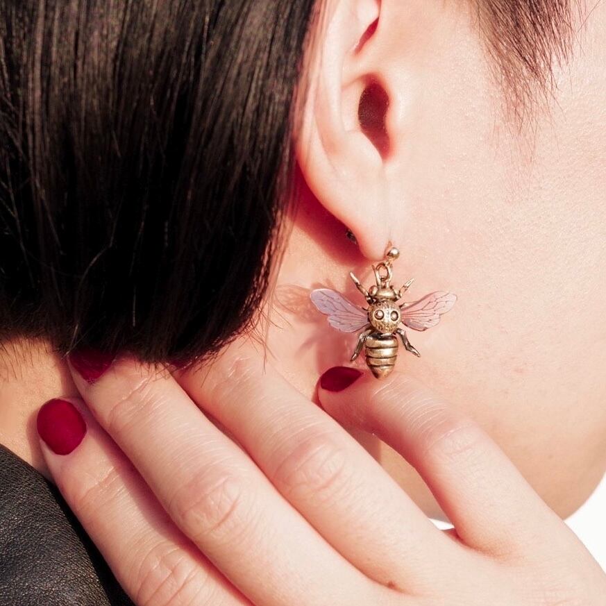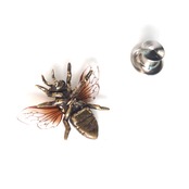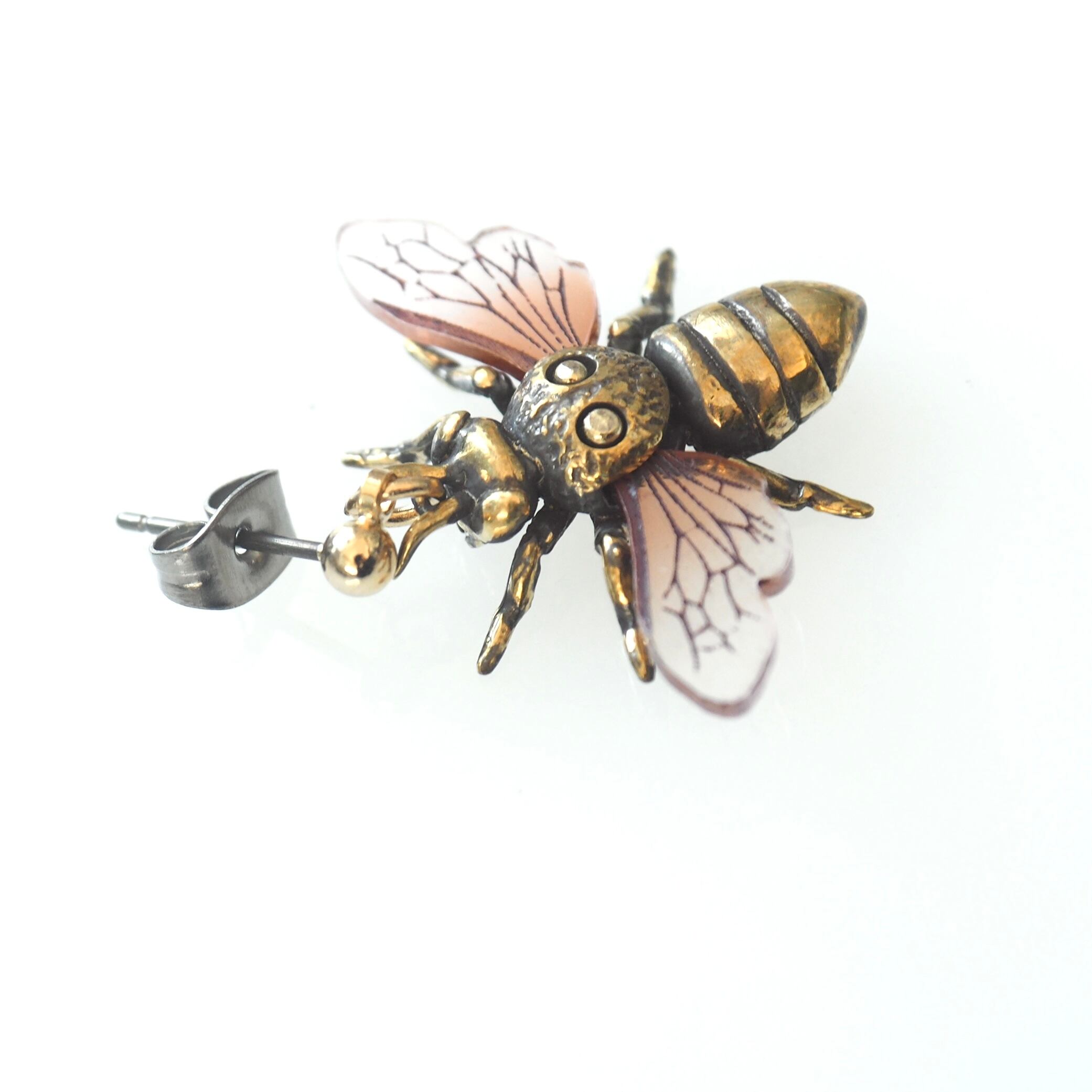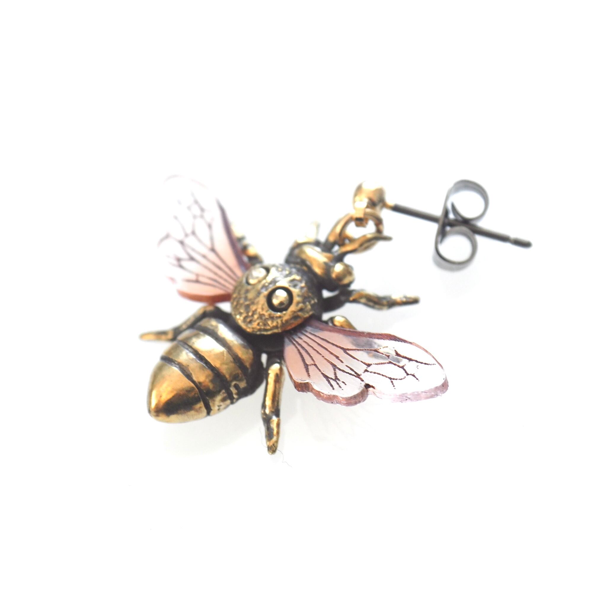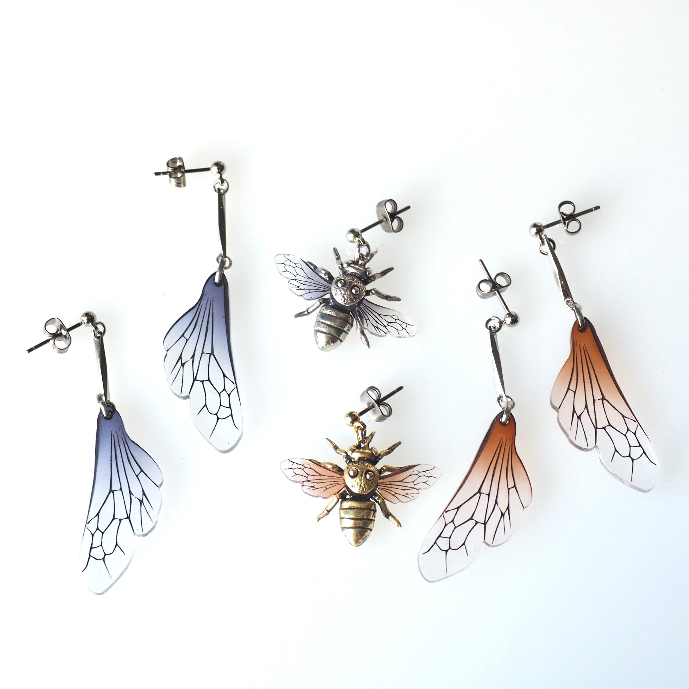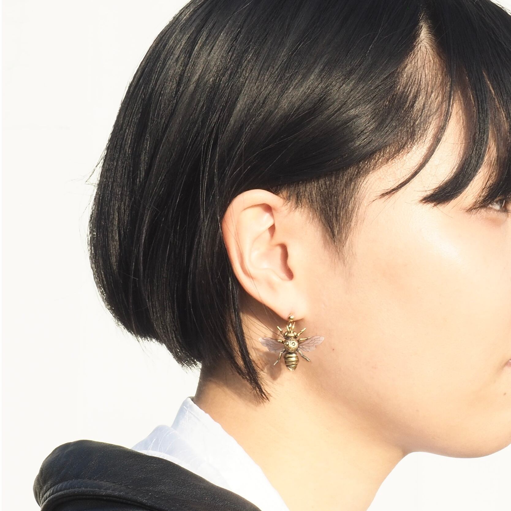 真鍮のボディーにアクリルの羽を組み合わせた、個性的なピアス。