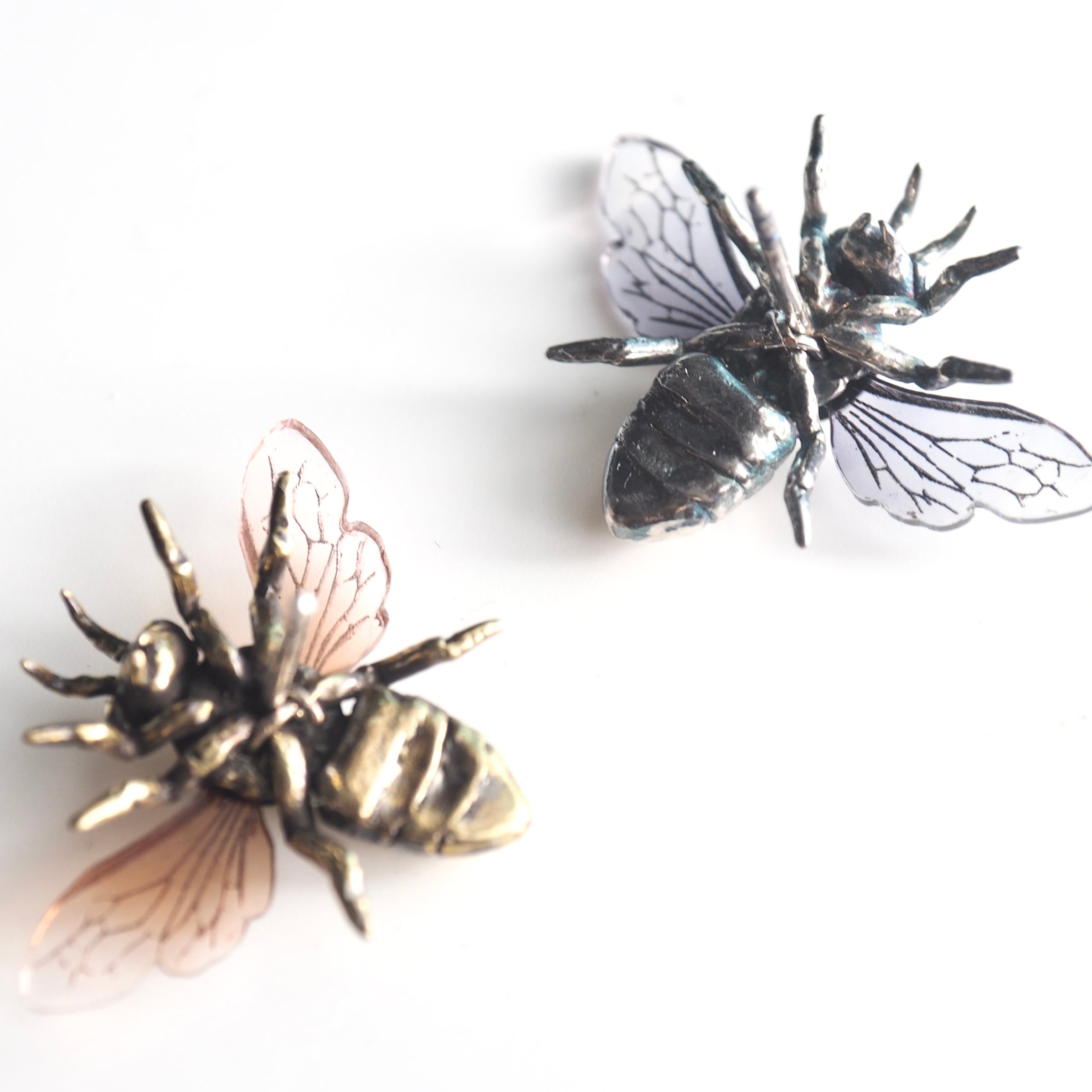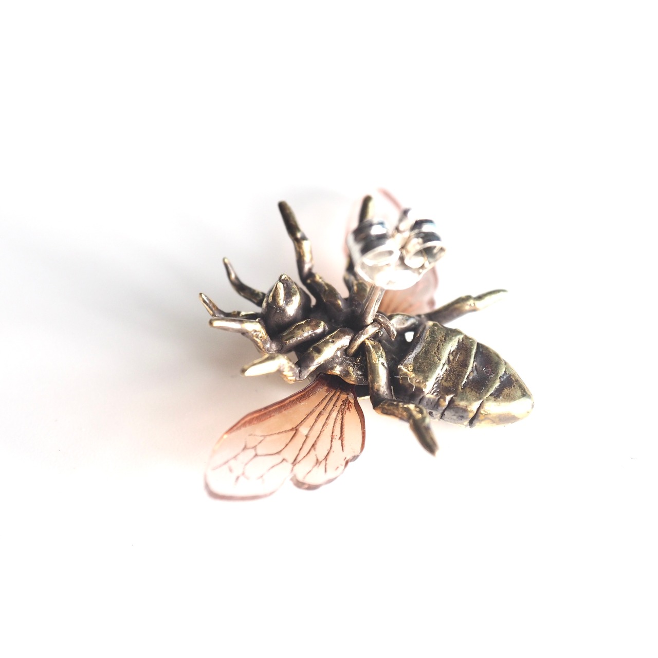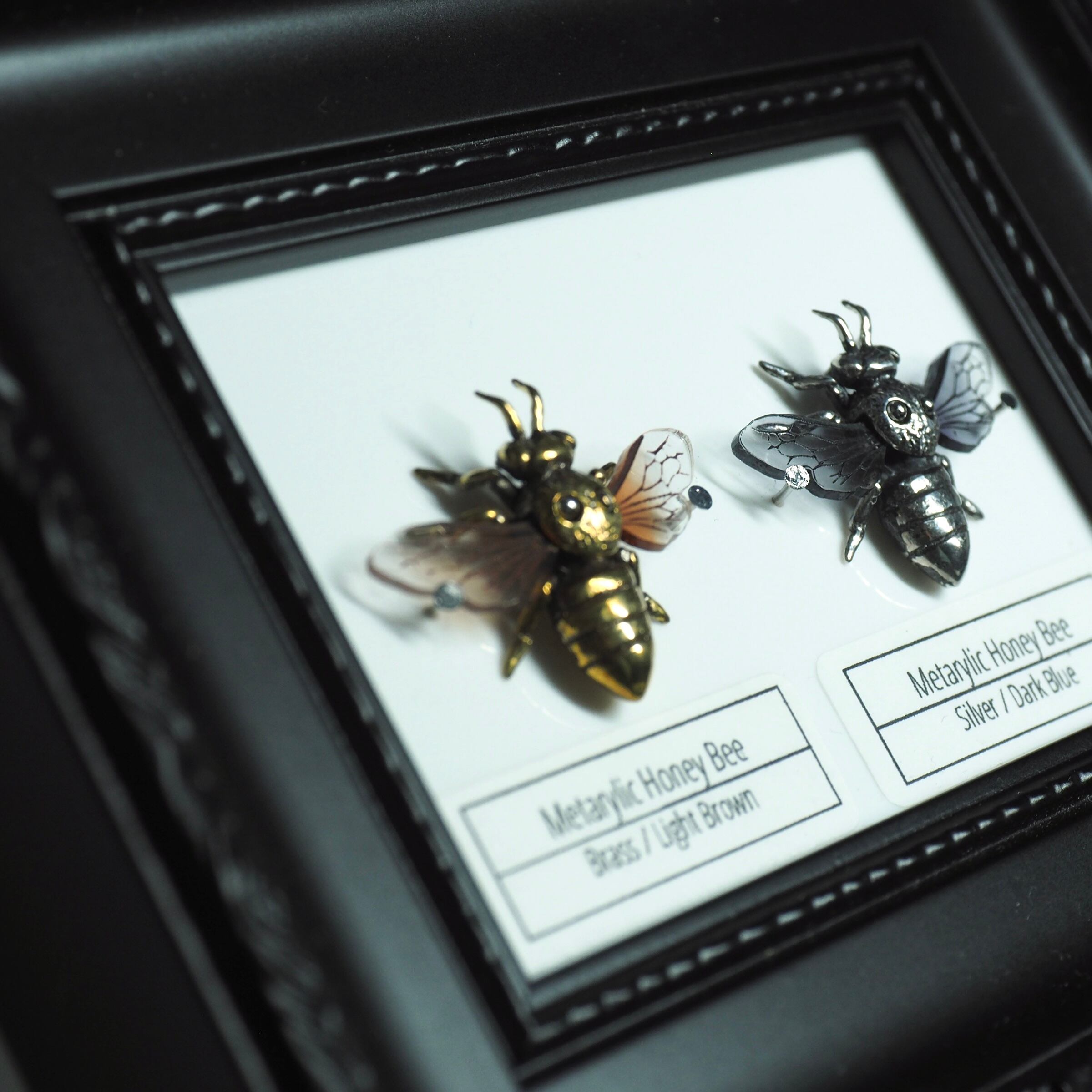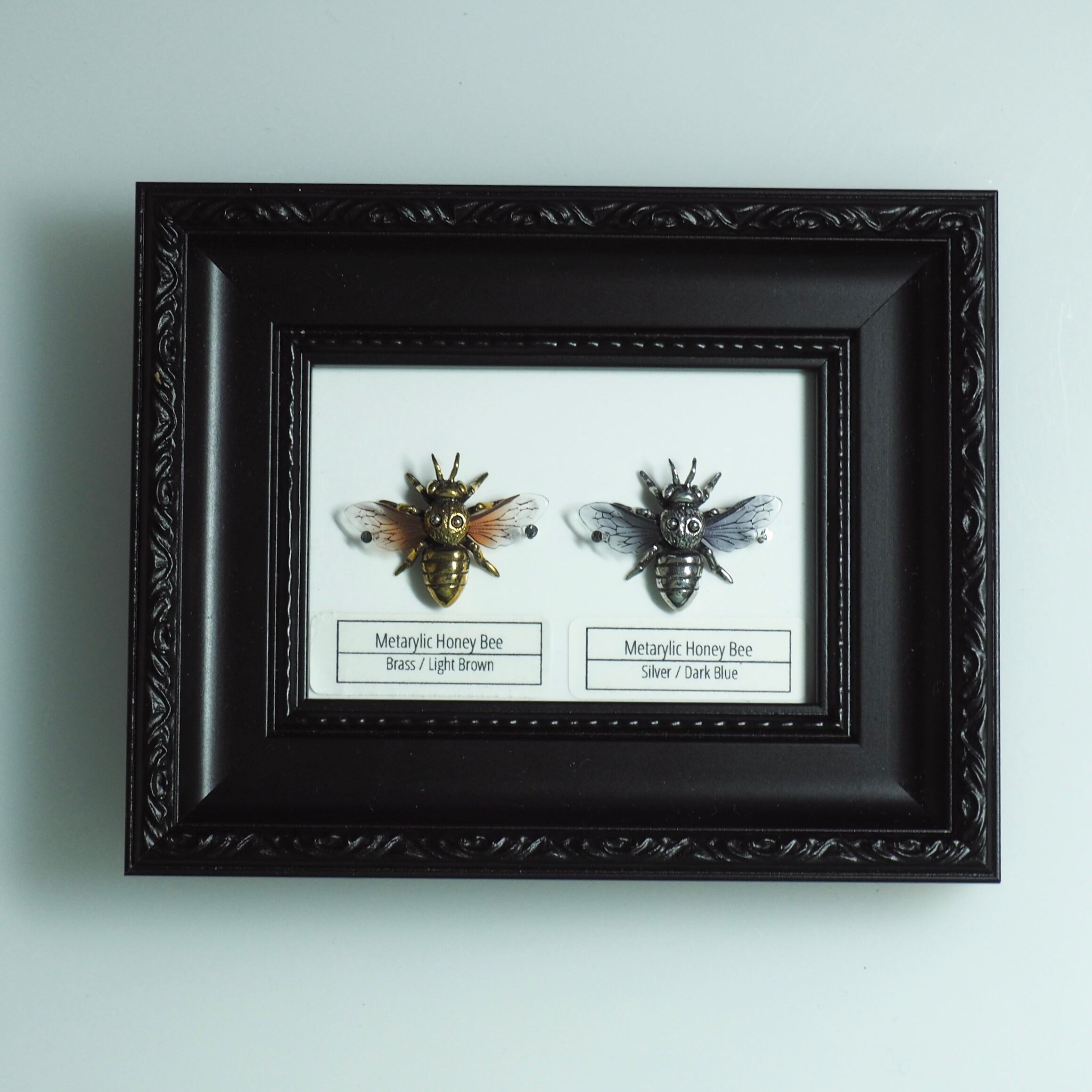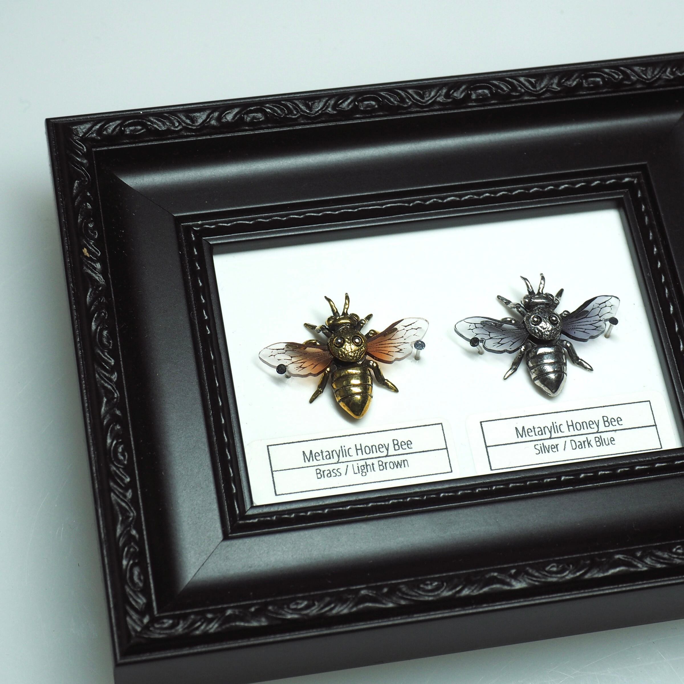 金属のボディーにアクリルの羽を組み合わせた、個性的な蜜蜂を標本にしました。重厚感のある金属と透明感のあるアクリルが調和の取れた美しい蜜蜂です。