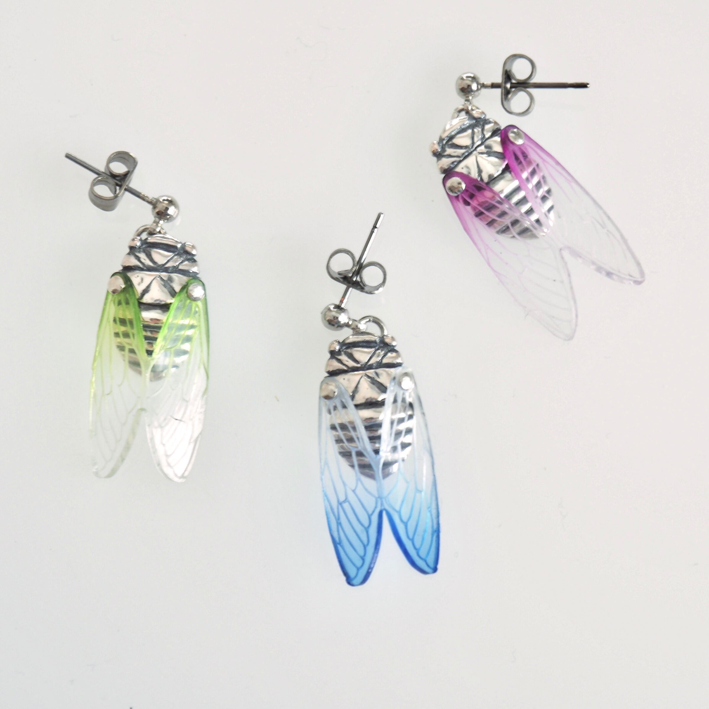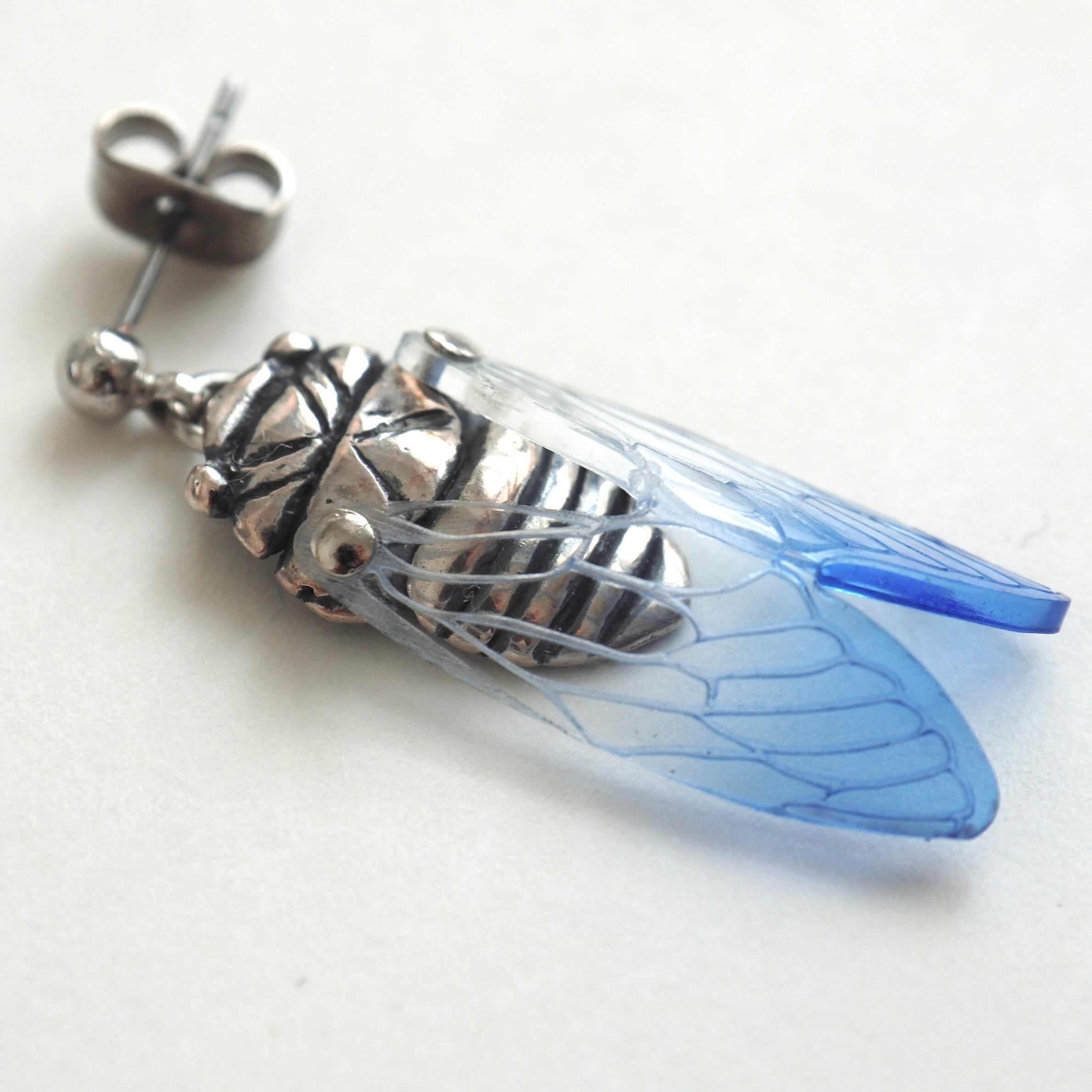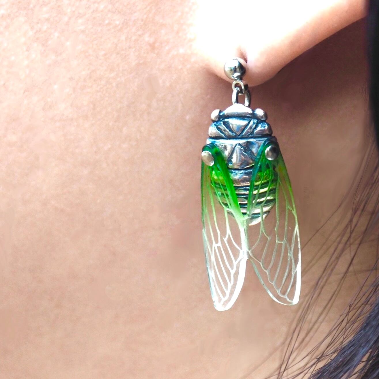 シルバー(SV935)のボディーにアクリルの羽を組み合わせた、個性的な蝉のミニピアスとブローチ。