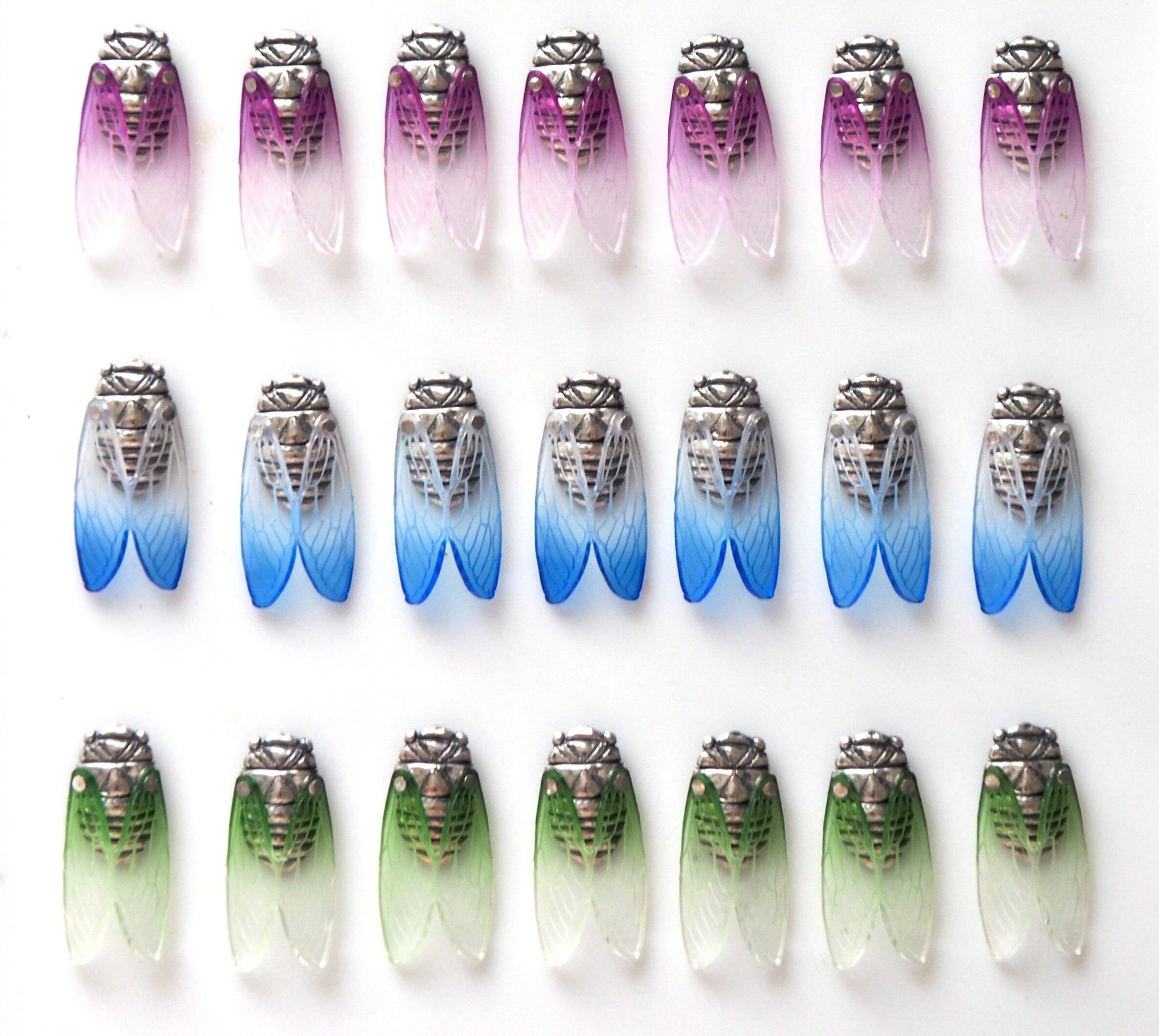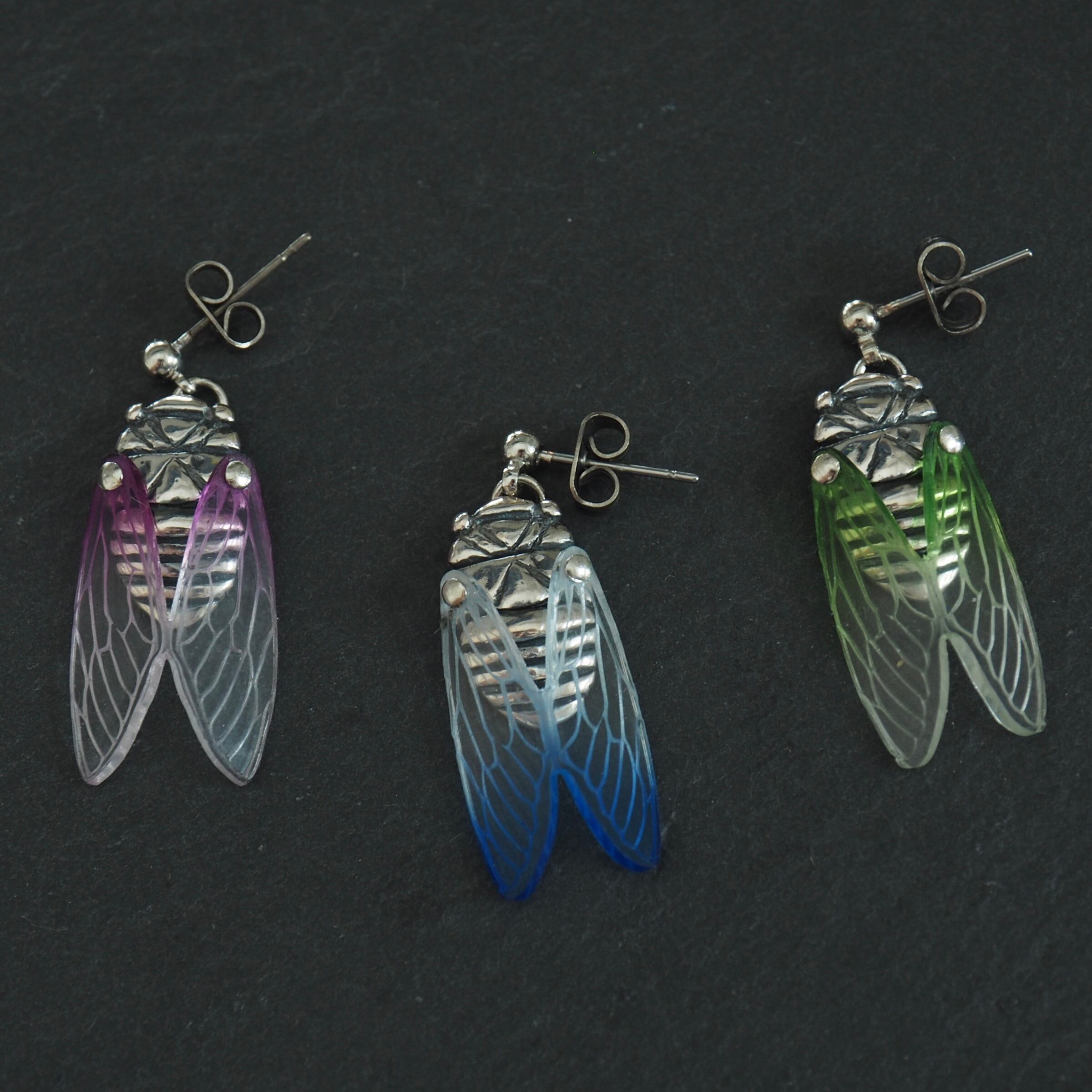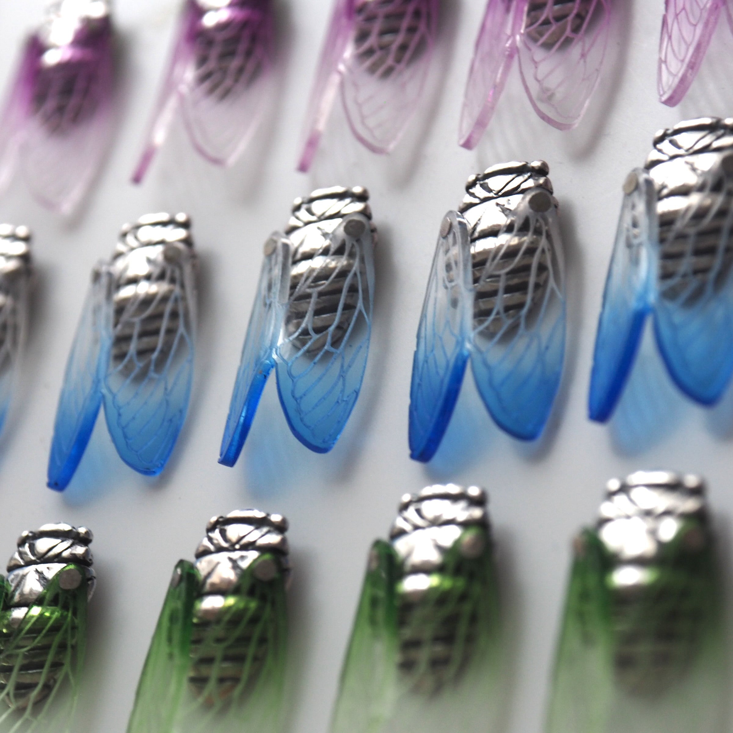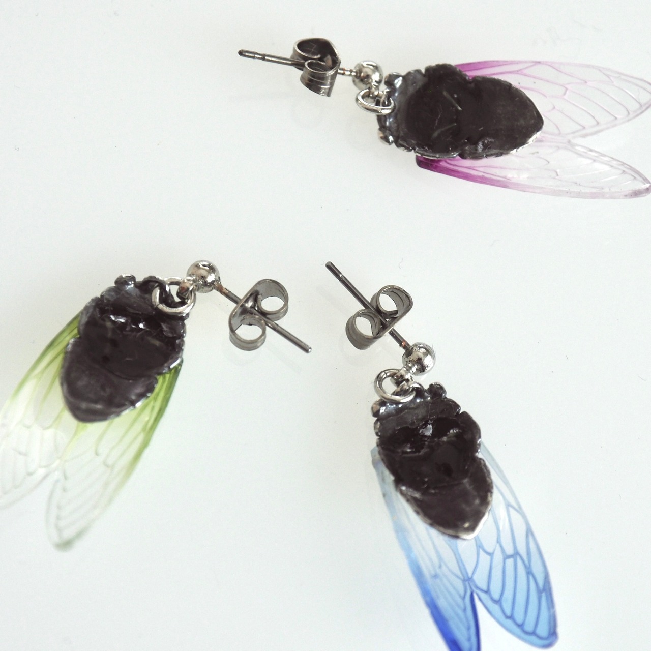 シルバー(SV935)のボディーにアクリルの羽を組み合わせた、個性的な蝉のミニピアスとブローチ。