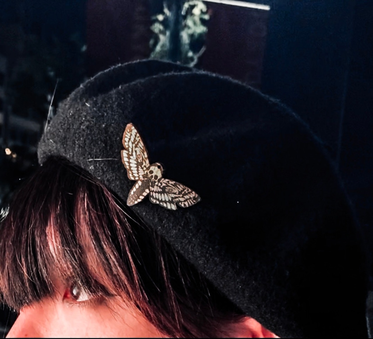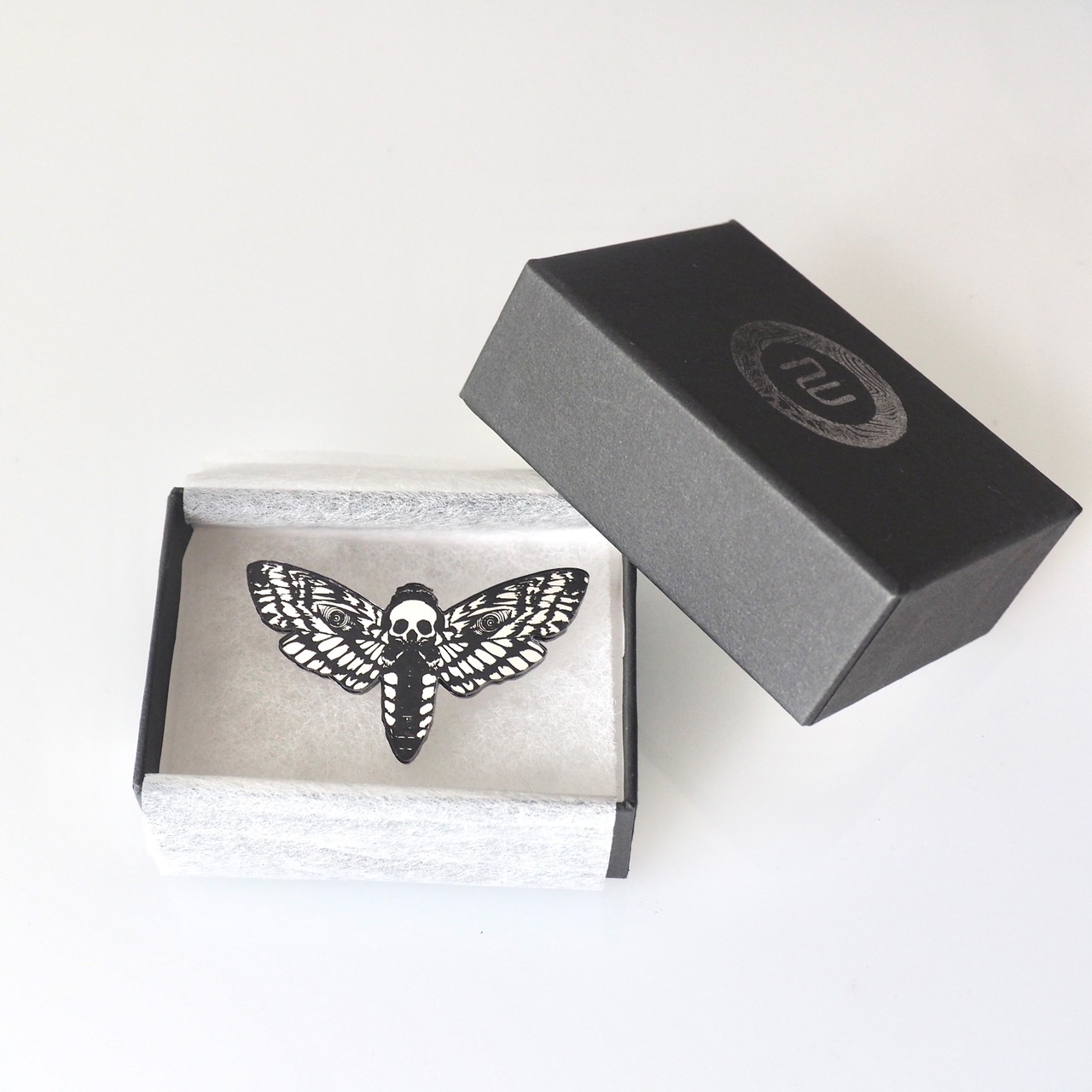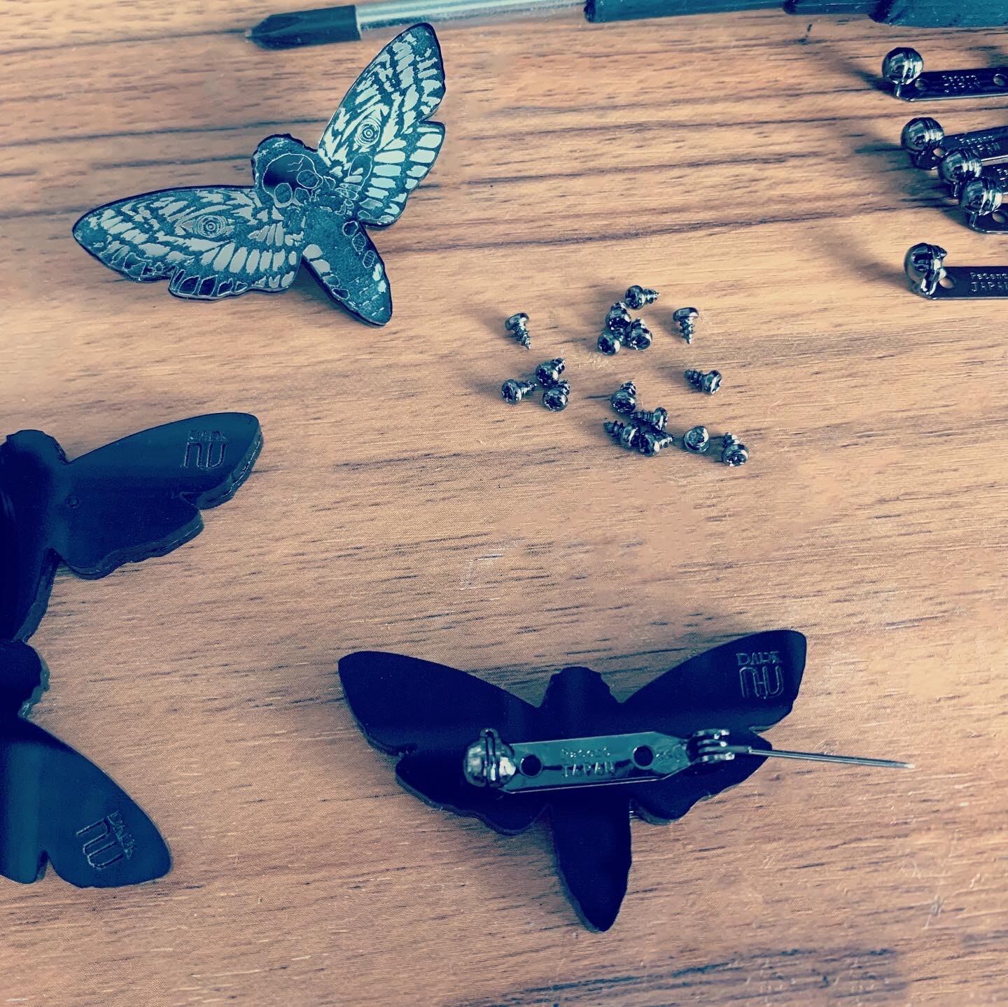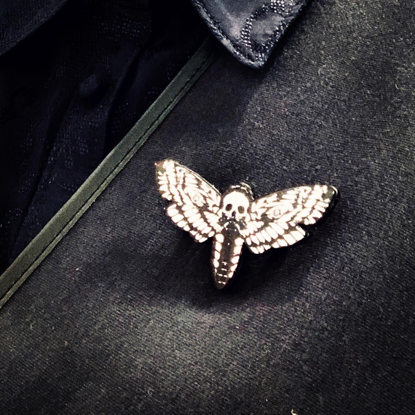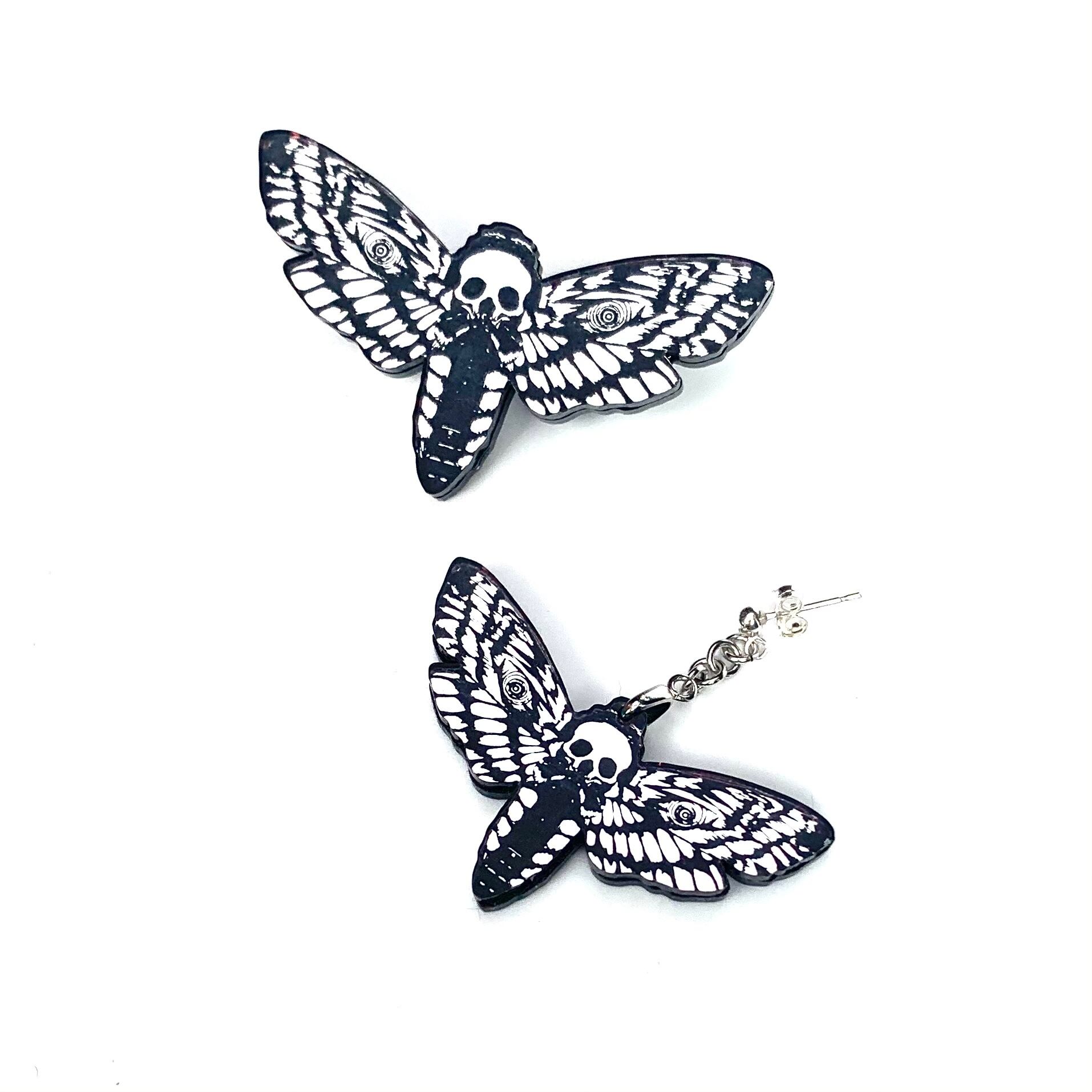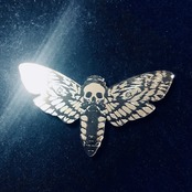 メンガタスズメという背中にドクロ模様のある蛾をモチーフにデザインしました。クールで印象的なミラーブローチです。
