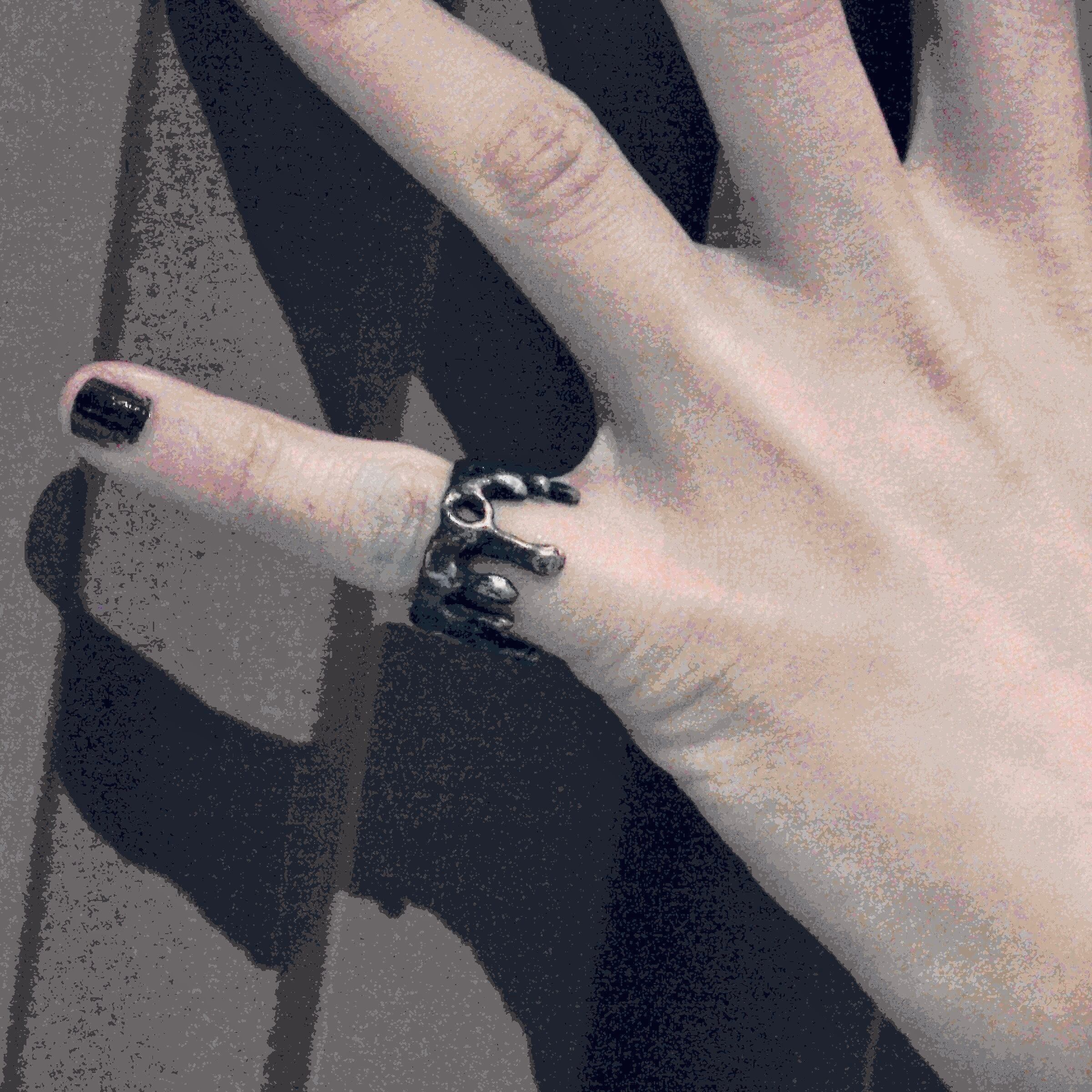 使用を重ねますと、凸部分の黒塗装が摩耗し、マッドでアンティークな風合いをお楽しみいただけます。(特にピンキーリングとして使用される際により顕著となります)